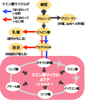 ピルビン酸はさらにアセチルCoAという物質になり、クエン酸サイクルへと進むのだ。 吸収された糖質がクエン酸サイクルに入ってしまえばすべてエネルギーに代わり、脂肪合成されることはないので体脂肪はたまらない、ということになる。 |